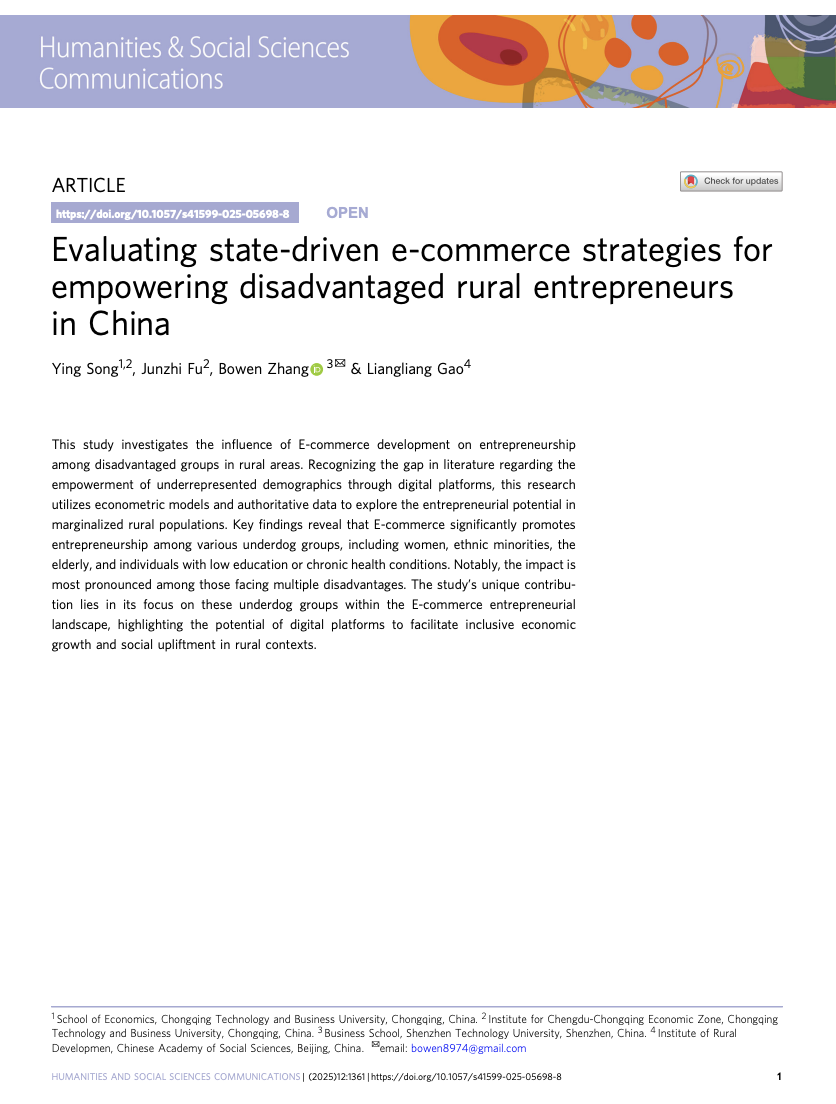 2025年8月25日,suncitygroup太阳新城官网助理教授张博文在人文社科领域取得重要突破,其研究成果Evaluating state-driven e-commerce strategies for empowering disadvantaged rural entrepreneurs in China(国家主导型电商策略赋能弱势农村创业者的实效评估)于2025年在《Humanities and Social Sciences Communications》(《人文社科通讯》)正式线上发表。该研究通过混合研究方法系统分析中国农村电商政策对弱势群体的赋能机制,为全球减贫实践提供了关键实证依据。